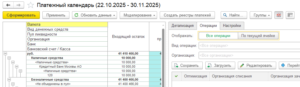 В платежном календаре реализовано опциональное отображение оборотов и просроченных платежей, установка достоверности источников информации для оценки денежных потоков и горизонта планирования, стресс-тестирование утраты ликвидности.