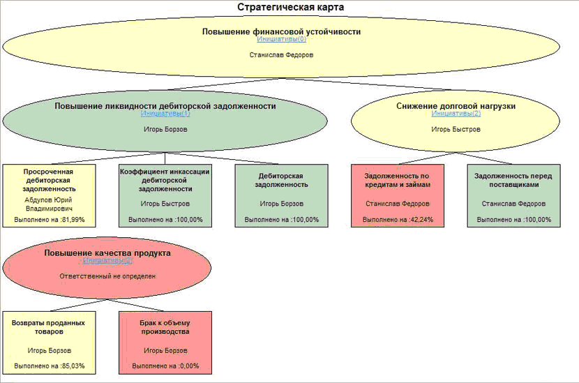 Другой формой представления стратегической счетной карты является наглядная диаграмма, отражающая степень достижения целей, а также их декомпозицию до KPI. Для удобства интерпретации цвета целей соответствуют диапазонам достижения заданных плановых показателей.